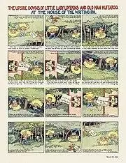 American comics developed out of such magazines as Puck, Judge, and Life. The success of illustrated humour supplements in the New York World and later the New York American, particularly Outcault's The Yellow Kid, led to the development of newspaper comic strips. Early Sunday strips were full-page[15] and often in colour. Between 1896 and 1901 cartoonists experimented with sequentiality, movement, and speech balloons.[16] A noteworthy example is Gustave Verbeek, who wrote his comic series "The UpsideDowns of Old Man Muffaroo and Little Lady Lovekins" between 1903 and 1905. These comics were made in such a way that one could read the 6-panel comic, flip the book and keep reading. He made 64 such comics in total. In 2012 a remake of a selection of the comics was made by Marcus Ivarsson in the book 'In Uppåner med Lilla Lisen & Gamle Muppen'. (ISBN 978-91-7089-524-1)