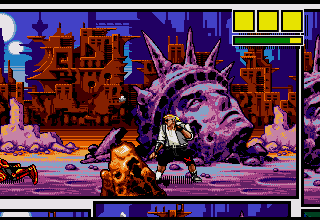 Comix Zone is an action platformer in which players control Sketch as he progresses through panels of his comic book, hoping to reach the end and escape before his own creations finish him off. Each level consists of two pages and secrets are discovered by shredding the paper and revealing items. Along with standard attacks such as punching, kicking and jump attacks, Sketch can store up to three items in his inventory to help him overcome obstacles. Along with weapons such as bombs and knives which can also be used to destroy obstacles, Sketch can pick up iced tea to restore his health, and a fist that transforms Sketch into Super Sketch, dealing a powerful attack on all on-screen enemies. His pet rat Roadkill can discover hidden items and access areas that are too dangerous for Sketch to reach.