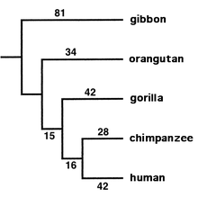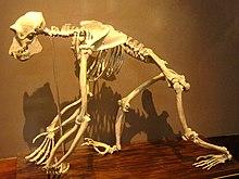 Chimpanzees are adapted for both arboreal and terrestrial locomotion. Arboreal locomotion consists of vertical climbing and brachiation.[36][37] On the ground chimps move both quadrupedally and bipedally, which appear to have similar energy costs.[38] As with bonobos and gorillas, chimps move quadrupedally by knuckle-walking, which probably evolved independently in Pan and Gorilla.[39] The physical strength of chimps is around 1.5 times greater than humans, due to higher content of fast twitch muscle fibres, one of the chimpanzee's adaptations for climbing and swinging.[40]