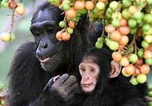 The chimpanzee is an omnivorous frugivore. It prefers fruit above all other food items but also eats leaves and leaf buds, seeds, blossoms, stems, pith, bark and resin.[48][49] A study in Budongo Forest, Uganda found that 64.5% of their chimp feeding time concentrated on fruits (84.6% of which being ripe), particularly those from two species of Ficus, Maesopsis eminii and Celtis durandii. In addition, 19% of feeding time was spent on arboreal leaves, mostly Broussonetia papyrifera and Celtis mildbraedii.[50] While the chimpanzee is mostly herbivorous, it does eat honey, soil, insects, birds and their eggs, and small to medium-sized mammals, including other primates.[48][51] Insect species consumed include the weaver ant Oecophylla longinoda, Macrotermes termites and honey bees.[52][53] The western red colobus ranks at the top of preferred mammal prey. Other mammalian prey include red-tailed monkeys, infant and juvenile yellow baboons, bush babies, blue duikers, bushbucks, and common warthogs.[54]
