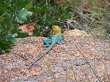 The common collared lizard (Crotaphytus collaris), also called eastern collared lizard,[2] Oklahoma collared lizard, yellow-headed collared lizard or collared lizard, is a North American species of lizard from the family Crotaphytidae. with a large head and powerful jaws. The name "collared lizard" comes from the lizard's distinct coloration, which includes bands of black around the neck and shoulders that look like a collar. Males can be very colorful, with blue green bodies, yellow stripes on the tail and back, and yellow orange throats.