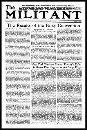 On November 15, 1928, the first issue of a new tabloid newspaper for the fledgling supporters saw light, The Militant — a paper tellingly subtitled "Semi-Monthly Organ of the Opposition Group in the Workers (Communist) Party of America."[14] The paper was aimed directly at members of the Communist Party, whom the expelled Trotskyists considered a vanguard organization that would be most interested in their ideas.[15]