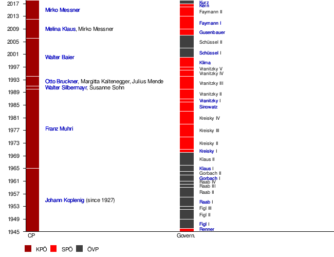 The chart below shows a timeline of the communist chairpersons and the Chancellors of Austria. The left bar shows all the chairpersons (Bundesparteivorsitzende, abbreviated as "CP") of the KPÖ, and the right bar shows the corresponding make-up of the Austrian government at that time. The red (Social Democratic Party) and black (Austrian People's Party) colours correspond to which party led the federal government (Bundesregierung, abbreviated as "Govern."). The last names of the respective chancellors are shown, the Roman numeral stands for the cabinets.
