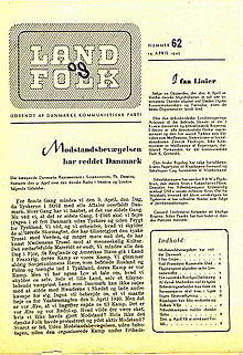 During the German occupation of Denmark, the party began publishing a clandestine newspaper called Politiske Maanedsbreve (Political Monthly Letters), which was soon renamed Land og Folk (Land and People).[6] It was one of the most widely circulated underground papers in the country,[6] and continued as the main press organ of the DKP until 1982. In addition, the DKP published a large number of local papers.[6]