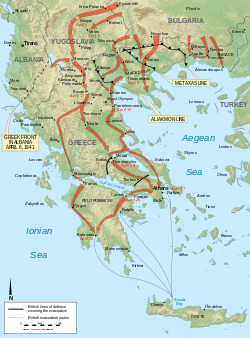 A large number of KKE members were already in prison before the Nazi invasion. The pro-Nazi occupation government handed some of them over to the Nazis fearing that they—following the pro-Soviet party line—would resort to sabotage in Greece following Hitler's attack on the Soviet Union on 22 June 1941.[52][53][54][55] There were many occasions that police officers released Communist prisoners, especially the ones that they were in exile in Aegean islands. In 1941, several KKE members managed to escape prison. One of the many stories includes the 20 communists held as political prisoners in Heraklion, Crete. They demanded to be released to fight against the invading Germans. The Greek government, which had left mainland Greece by then and was en route to Egypt, had no power to release them. They eventually escaped after their jail was damaged by German bombs and joined the British and Greek forces defending the Heraklion harbor. After the fall of Crete, many officers of the Greek Army joined forces with ELAS and became commanders in ELAS's corps of partisan units.[56][57]