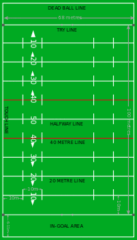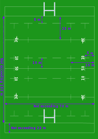 A rugby union pitch is between 106 and 144 metres long by 68 to 70 metres wide. The length from try line to try line varies between 94 and 100 metres, with a distance of 6 to 22 metres between the goal and dead-ball lines. Lines are painted at the dead-ball line, goal line, 22-metre line, 10-metre line (broken line) and halfway. Lines are also located 5 metres away from the goal line and touchline and 15 metres away from the touchline. At the goal line is a set of goal posts in the shape of the letter 'H', used for other forms of point scoring: drop goal, penalty and conversion.