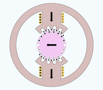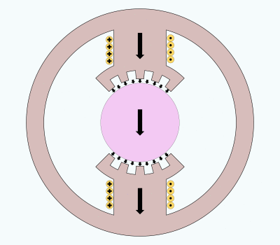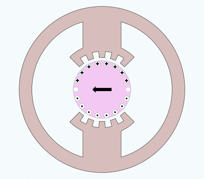 Figure E. shows compensation wires in the field pole face plate that are carrying current opposed to the current in the armature wire adjacent to the gap. The flux in the gap has been restored to the same condition as the case where there is no armature flux. Even though the armature wires are next to wires carrying current in the opposite direction, the wires of the armature still experience magnetic force from interaction with the field flux.