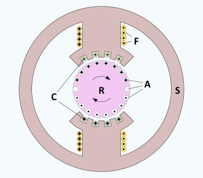 Figure A. shows a cross-sectional view of a two pole DC shunt motor. Armature windings (A), field windings (F) and compensation windings (C) use the dot and cross convention where a circle with a dot is a wire carrying current out of the figure and a circle with a cross is a wire carrying current into the page. For each wire in the armature that is next to the field pole face plate there is a wire in the face plate carrying current in the opposite direction.