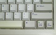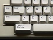The Compose Character key[2][3] was introduced by engineers at Digital Equipment Corporation (DEC) on the LK201 keyboard, available since 1983 with the VT220 terminal.[4] The keyboard included an LED indicating that a Compose sequence is on-going.[5] While the LK201 introduced the group of command keys between the alphanumerical block and the numerical keypad, and the "inverted T" arrangement of arrow keys, which have become standard,[6] the compose key by contrast did not become a standard.