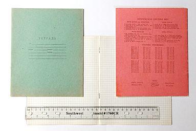 • A "thin" notebook (Russian: школьная тетрадь, school notebook) with 12, 18, or 24 sheets, having size 170 x 205 mm. They are stapled through the fold, which, aided by their thinness, allows to open them completely flat, simplifying writing on the left side. These notebooks are used for daily work in primary school like teaching penmanship and arithmetic, and are often collected for review and grading. These notebooks are called copybooks at English language lessons in Russian schools.[2]
