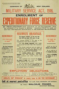 - ^ 'Military Service Act 1916', URL: http://www.nzhistory.net.nz/media/photo/military-service-act-1916, (Ministry for Culture and Heritage), updated 29 July 2014