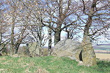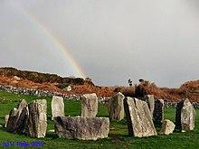 Recumbent stone circles are a variation containing a single large stone placed on its side. The stones are often ordered by height, with the tallest being the portals, with gradually reducing heights around each side of the circle, down to the recumbent stone, which is the lowest.[8] The type is found throughout the British Isles and Brittany, with 71 examples in Scotland,[9] and at least 20 in south-west Ireland. In the latter nation they are generally called axial stone circles, including Drombeg stone circle near Rosscarbery, County Cork.