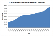 CUW has doubled in total enrollment from 3719 in 1995–96 to 7485 students in 2010–11. Adult education programs were also expanded, thereby topping the list of the largest such programs in higher education for the Lutheran Church. CUW's enrollment makes it the largest Lutheran university in the United States.[5][6]