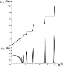 The quantum Hall effect was discovered by Klaus von Klitzing, Dorda and Pepper in 1980 when they observed the Hall conductance to be integer multiples of a fundamental constant .(see figure) The effect was observed to be independent of parameters such as system size and impurities.[33] In 1981, theorist Robert Laughlin proposed a theory explaining the unanticipated precision of the integral plateau. It also implied that the Hall conductance can be characterized in terms of a topological invariable called Chern number which was formulated by Thouless and collaborators.[35][36]:69, 74 Shortly after, in 1982, Horst Störmer and Daniel Tsui observed the fractional quantum Hall effect where the conductance was now a rational multiple of a constant. Laughlin, in 1983, realized that this was a consequence of quasiparticle interaction in the Hall states and formulated a variational method solution, named the Laughlin wavefunction.[37] The study of topological properties of the fractional Hall effect remains an active field of research.[38] Decades later topological band theory advanced by David J. Thouless and collaborators[39] was further expanded leading to the discovery of topological insulators.[40][41]