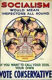 Nigel Keohane finds that the Conservatives were bitterly divided before 1914, especially on the issue of Irish Unionism and the experience of three consecutive election losses. However the war pulled the party together, allowing it to emphasise patriotism as it found new leadership and worked out its positions on the Irish question, socialism, electoral reform, and the issue of intervention in the economy. The fresh emphasis on anti-Socialism was its response to the growing strength of the Labour Party. When electoral reform was an issue, it worked to protect their base in rural England.[32] It aggressively sought female voters in the 1920s, often relying on patriotic themes.[33]