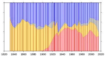 The party's support base has historically consisted primarily of middle class voters, especially in rural and suburban areas of England. Its domination of British politics throughout the 20th century and its re-emergence in the 2010s has led to it being referred to as one of the most successful political parties in the Western world.[14][15][16]