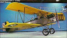 The PT-1 became the first training airplane purchased by the USAAS in substantial quantity following World War I. Aviation cadets in Texas and California flew it extensively during the late 1920s and early 1930s. It acquired the nickname 'Trusty' for their excellent ability to make a quick and effective recovery from a spin.[1] Easy to fly, the Trusty made some students overconfident, and they received a shock when they advanced to faster airplanes with more difficult handling characteristics. The 'Trusty' was commonly flown without its cowlings in an effort to prevent overheating[3]