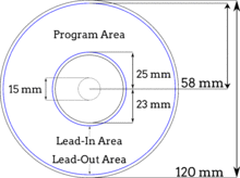 In case of a 12 cm standard diameter disc, data at the outermost edge (6 cm from center) is accessed at 2.4 times the speed of data at the inner edge of the data-containing program area (2.5 cm from center).[1]