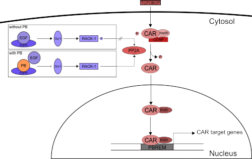 Alternatively, PP2A might be activated through another pathway including the epidermal growth factor receptor (EGFR) and the receptor for activated C kinase 1 (RACK1). In the absence of PB, the epidermal growth factor (EGF) binds to EGFR, thereby activating the steroid receptor coactivator-1 (Src1), which in turn phosphorylates RACK1. Upon PB-exposure, PB binds competitively to EGFR and thus leads to inactivation of Src1. This results in a dephosphorylation of RACK1, which can subsequently stimulate PP2A to activate CAR.[19]