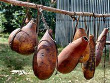 Humans have used containers for at least 100,000 years, and possibly for millions of years.[4] The first containers were probably invented for storing food,[4][5] allowing early humans to preserve more of their food for a longer time, to carry it more easily, and also to protect it from other animals. The development of food storage containers was "of immense importance to the evolving human populations", and "was a totally innovative behavior" not seen in other primates.[6] The earliest containers were probably objects found in nature such as hollow gourds,[7] of which primitive examples have been found in cultures such as those of the Tharu people,[8] and native Hawaiian people.[9] These were followed by woven baskets, carved wood, and pottery.