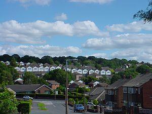 In the 19th century a new road was constructed (now the A660 Otley Road), and the Bramhope Tunnel dug by Moseley farm for a rail line going north from Leeds to Harrogate. A large house called Cookridge Lodge and a tower added. It was demolished in 1970 to make way for an estate, but the gatepost and some outbuildings survive.[7] The Cookridge Estate was bought by Richard Wormald in 1820 and sold in portions by his descendant Francis Wormald in the 1920s.[10] In 1926 Cookridge became part of Leeds and the building of Cookridge village began in 1927 with a triangle of houses between Cookridge Lane, Moseley Wood Lane and Green Lane.[7] This was largely under the direction of architect Cecil Crowther and his builder brothers, taking advantage of subsidies from the Housing Acts of 1923-1925. Mavis Lane and Mavis Avenue are named after Cecil Crowther's daughter.[10] Crowther acted as estate agent and produced a 1930 brochure entitled Cookridge - Village of Youth extolling its virtues for newly-weds.[11] This included a map showing 135 plots of an area largely bounded by Cookridge Lane to the east, Moseley Wood Lane to the south, and Cookridge Avenue to the north-west. There were six firms of builders, with different styles.[10] Sporadic building continued, but it was after the Second World War that the majority of the estates were constructed, starting with 1948 Iveson and Ireland Wood; 1952 Tinshill, Silkmill and Woodnook; 1957 Moseley Wood; 1973 Holt Park; 1980 Spring Wood.[7] As the names suggest, these made major encroachments into woodland.