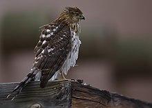 In denser forest areas, these hawks tend to prefer easy access to edges, clearings, roads and waterways.[2][5][91] For example, average distance from waterways away from nests in Wisconsin and Utah was 66.1 and 224 m (217 and 735 ft), respectively.[92][93] However, in the Appalachians, there seemed to no detectable preference for access to water.[94] Forest edges, in particular, tend to be key as these are peak hunting grounds for these hawks.[95][96] Cooper's hawks usually occur at elevations from sea-level to 2,500 m (8,200 ft), more infrequently up to 3,000 m (9,800 ft). In the American southwest and northwestern Mexico, they are commonly considered a bird of wooded foothills, often dwelling above 1,000 m (3,300 ft).[2][39] Although they often live in areas where deciduous trees are predominant, almost throughout the range they are often attracted to stands of conifers, which, due to their density, provide more extensive shelter and perhaps a more sturdy nesting site.[7] Therefore, in areas such as Massachusetts and Wisconsin, they most often utilized stands of white pines (Pinus strobus).[6][92] Additional Wisconsin studies showed that exotic conifer stands now support many Cooper's hawks even where native woodland is available.[97] Tall, native deciduous tree stands may still be used extensively elsewhere, i.e. American beeches (Fagus grandifolia) in New York (nearly 40% of nest trees used) and oaks in Maryland (60% of trees used as nests).[7] This species often prefers fairly mature forest, i.e. in two different areas of Oregon, the Cooper's hawks preferred areas with trees of 30–60 years old (and 656 trees per ha) and 50–70 years old (and 1159 trees per ha), respectively.[91] On average, the number of trees per hectare in Arkansas were found to be 935.7.[85] Canopy coverage is key to nesting Cooper's hawks, needing to be at minimum about 55-70%, averaging 55% in Wisconsin and 69.8% in Arizona.[98][99][100]