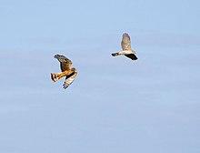 The ecology of Cooper's hawks has also been studied in contrast to other diurnal raptors as well. In the raptor guild within southern Michigan, the overall food breadth and size was studied against red-tailed hawks, red-shouldered hawks and American kestrels. Here, although the food niche breadth (mean number of prey species per study site) of the Cooper's was relatively low at 1.79, the Cooper's hawk had the largest mean prey sizes at 67.4 g (2.38 oz), which was considerably higher than even the much larger red-tailed hawk (mean prey mass of 43.4 g (1.53 oz)).[153][285] In southern Wisconsin, the food niche breadth was rather higher for the Cooper's at 6.9 and the mean prey mass, at 109.9 g (3.88 oz), was second only to the red-tailed hawk's. In the Wisconsin data, the red-shouldered, the broad-winged and rough-legged hawks (Buteo lagopus) as well as the northern harrier, peregrine falcon (Falco peregrinus) and the American kestrel all had lower mean prey masses.[285] Much farther south in Durango, Mexico, while there was overlap in the class of prey selected by Cooper's hawks with the other studied raptor species, American kestrels, red-tailed and zone-tailed hawks (Buteo albonotatus), there was minimal overlap in which prey species were usually selected, especially given the difference in habitat usage. Furthermore, in Durango, while Cooper's and the Buteo hawks all took appreciable numbers of adult cotton rats, kestrels selected only young cotton rats.[250] In a study in western Maryland, Cooper's hawks used more mature woodland with a more developed understory and more extensive ground cover than the other woodland nesting hawks, the broad-winged and red-shouldered hawks. While red-tailed hawks nested fairly high in the Maryland data in isolated pines somewhat out of the interior forest, the Cooper's nests were at similar height in forest and slightly higher than those of red-shouldered hawks and much higher than those of broad-winged hawks.[94] In what was probably a case of defense of their hunting ground, a female Cooper's hawk was recorded to attack and drive off (without physical contact) a larger peregrine falcon from a perch during winter in Ontario.[286]