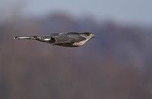 Migratory movements in the autumn are generally between late August to mid-October, peaking at the end of September and beginning of October in the east, but sometimes migration extend into November.[5][133] Meanwhile, spring northward migration may be any time from the end of February to May, with the last ones leaving Mexico in April and very late individuals were passing over south Texas in late May.[2][5] Generally, spring migration is more dispersed and less consistent than fall migration.[7] There is evidence from the Great Lakes region that spring migration is occurring sooner due to warming temperatures in recent years.[134] Passage appears to be timed to coincide with that of their main prey, medium-sized birds.[5] In migration, first-year juveniles precede two-year-old hawks which themselves precede adults when moving south in fall. Furthermore, females of all ages tend to migrate sooner and spend longer in winter quarters than like-age males, the latter staying relatively north and traveling back again earlier.[2][133][135] Interestingly, the sharp-shinned hawk (despite the even more dimorphic migration times between sexes) showed no strong difference in distance on migration between the sexes, unlike female Cooper's which sometimes can move considerably further than males.[124] At regular western migration sites, the average difference of passage timing for Cooper's hawks of the earlier females and later males of like-age was five days.[136] In the Marin Headlands, migration of the sexes differed by 6 days in juvenile, first-year females and males and by 11 days in older females and males.[135] Like other Accipiters (but unlike falcons), Cooper's appear to not start moving until day is warmer and thermals can be used.[5] During migration they favor mountain ridges and coastlines, which coincide with migratory raptors routes in general.[7] This species can seem to cross some bodies of water unlike most sharp-shinned hawks but seldom do so over wide bodies of water.[5] However, they have been seen to turn up in such oceanic vicinities as the Florida Keys and Cuba, and so are capable of crossing larger than usual bodies of water.[28][137] It is thought that Cooper's hawks also avoid the Great Plains while migrating as well.[43] Like many other raptors, Cooper's hawks favor strong northwesterly winds during autumn passage.[138][139]