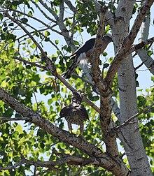 Somewhat over 60% of the bird species known in the Cooper's hawks’ prey spectrum are passerines (including thrushes and starlings). Other medium-sized to largish-bodied families of passerines tend to be most often selected.[62] In many circumstances, Cooper's hawks will hunt corvids, large, intelligent and social passerines, with the smallish jays being particularly popular.[5][7] In Missouri, the most often selected prey (12.7% of 259 prey items) was the 89 g (3.1 oz) blue jay (Cyanocitta cristata), which also important in northern Florida, i.e. 12.27% of 1100 prey items.[8][50] Steller's jays (Cyanocitta stelleri), at 107 g (3.8 oz) a larger western cousin of the blue jay, are also regularly selected in various studies, such as all studied areas of Oregon and New Mexico, where it was the second most regularly selected of prey species at 11.7% of 316 prey items.[179][192] California scrub jays (Aphelocoma californica) are regular supplemental prey in northern California studies as well.[186] Blue jays and other related species are among the most diligent mobbing birds in response to the presence of a Cooper's hawk although sometimes may let out an alarm call or even imitate a Cooper's calls merely to frighten other birds from a desired food source.[193][194] It was hypothesized that Steller's jays may be able to effectively confuse a Cooper's hawk by engaging in a chorus of calls at close range.[195] In Arizona, Mexican jays (Aphelocoma ultramarina) are known to play a key role in flicker ecology by watching out for Cooper's hawks.[196] Numerous other corvids may be hunted, including most overlapping jays, as well as the Clark's nutcracker (Nucifraga columbiana), black-billed magpie (Pica hudsonius), possibly yellow-billed magpie (Pica nuttalli) and a few species of crow.[47][179][197][198][199] One black-billed magpie was caught and killed by a Cooper's hawk when attempting to mob the hawk.[200] Incidents of predation have been witnessed on both young and adult American crow (Corvus brachyrhynchos), as well as on adult northwestern crow (Corvus caurinus). These hawks are also a potential predator of fish crow (Corvus ossifragus).[201][202][203][204] However, crows are potentially dangerous prey to Cooper's hawks. Adult American crows are about the same size as a female Cooper's hawk and can potentially cause considerable damage to a lone raptor during group mobbing, being capable of inflicting damage with both their feet and bill.[205] In at least one case, a murder of American crows was observed to drive a Cooper's hawk to the ground and possibly seriously injure it, although the fate of the hawk was not certain.[205] Cases of missing toes on Cooper's hawks are thought to have possibly come from failed predation of crows.[201] At least a dozen species of icterid are known to be hunted by Cooper's hawks as well. Common, widespread icterids such as red-winged blackbirds (Agelaius phoeniceus) and common grackles (Quiscalus quiscula) are fairly frequent prey for these hawks.[8][174][154] Cooper's hawks nesting near red-winged blackbird colonies may at times live almost entirely off of female blackbirds.[206] In the Black Hills, although prey species were seldom identified, evidence showed that most regularly selected prey were assorted icterids.[207] Even meadowlarks, such as the 93 g (3.3 oz) eastern meadowlark (Sturnella magna) which was the third most often selected prey in Ithaca, New York, and bobolinks (Dolichonyx oryzivorus) are taken despite their preference for grasslands well outside the typical habitats of Cooper's hawks.[174][179][188]