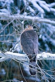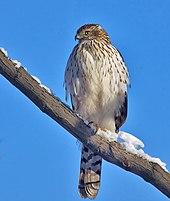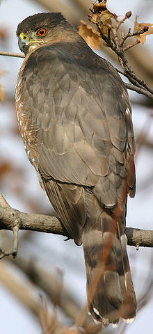 Cooper's hawk (Accipiter cooperii) is a medium-sized hawk native to the North American continent and found from southern Canada to Mexico.[2] This species is a member of the genus Accipiter, sometimes referred to as true hawks, which are famously agile, relatively small hawks common to wooded habitats around the world and also the most diverse of all diurnal raptor genera.[2] As in many birds of prey, the male is smaller than the female.[3] The birds found east of the Mississippi River tend to be larger on average than the birds found to the west.[4] It is easily confused with the smaller but similar Sharp-shinned hawk.