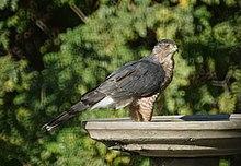 Cooper's hawks are known as bold and aggressive predators.[5][62] Given their dietary habits, these hawks bore a poor reputation well into the 20th century, with one account describing the species as "noxious," an “avian outlaw" and "a relentless tyrant and murderer of small birds." Another describes the species as a “bloodthirsty” “villain."[6][152] Early accounts underestimated the opportunistic nature of the Cooper's hawks’ hunting behavior and provided little insight into the actual effect the hawks have on their prey.[5][62] The maximum hunting range was estimated at 5.3 km2 (2.0 sq mi) in Michigan and 2 km2 (0.77 sq mi) in Wyoming.[153] In another Michigan study, most Cooper's hawks were found to be flying 0.8 to 1.2 km (0.50 to 0.75 mi) from their wooded nests to hunt on agricultural ground.[154] Males in New York usually covered more than 0.8 km (0.50 mi), sometimes up to 3 km (1.9 mi), during hunting efforts when flying away from the nest area.[56] Due to scattered prey availability in North Florida, females were nearly nomadic, wandering anywhere where food could be accessed (i.e. chicken farms, feedlots, bird feeders, etc.), while males were more typically devoted to hunting on their regular home range.[50] During hunts, Cooper's hawks rely on agile, twisting flights between bouts of perching and scanning, their flight suddenly picking up speed upon approach to the prey.[7][56][96] Hunting hawks typically utilize forest edge, open woodland and fencelines and such while hunting.[2] In southwestern Tennessee, the preferred hunting habitats in the non-breeding season were forest, then woodland edge, then lastly open country.[155] Near Stevens Point in Wisconsin, a male cling to quiet woods far more so than they were prevalent in the environment while females preferred to stay within 100 m (330 ft) of the nest whilst hunting.[103][156] This differed strongly in Tucson where hawks while hunting mostly in manmade environments such as residential areas, regional parks, and golf courses more so than they were prevalent in the environment, though usually where there were large (albeit usually non-native) trees.[157][158] The Cooper's hawk does attack birds attracted to bird feeders with a fair amount of frequency.[159][160] However, data from Indiana showed that birds using bird feeders were at no greater risk of attack than those in random transects, and the effect Cooper's can have on feeder birds may be at times exaggerated.[161]