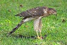 The species was named in 1828 by Charles Lucien Bonaparte in honor of his friend and fellow ornithologist, William Cooper.[5] Other common names for the Cooper's hawk include: big blue darter, chicken hawk, flying cross, hen hawk, quail hawk, striker, and swift hawk.[6] Many of the names applied to the Cooper's hawks refer to their ability to hunt large and evasive prey using extremely well-developed agility. This species primarily hunts small-to-medium-sized birds, but will also commonly take small mammals and sometimes reptiles.[7][8]
