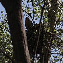 It has historically taken to almost be a rule that Cooper's hawk uses a new nest site each year.[33][56][175][343][358] Exceptionally, though, pairs have used the same nests for up to 4 years, though mostly records show up to 2 to 3 years of use when a nest is reused.[33][343] As much as 59% of 17 nests (New Mexico) or 66.7% of 12 nests (southern Illinois) may be reused in the following year but this is not usual.[343][334] In north Florida, 21% of nests were reused in a subsequent year, while in New York, it was around 10%.[56][50] New nests are often near prior nests, at a mean distance between them of around 170 m (560 ft) in Wisconsin.[114] In Alberta, a female was reported to use a grove of trees over two consecutive years as a nest site, be absent for one year and then returned to nest in the same grove the subsequent year.[359] Nest building usually takes about two weeks.[5][7] However, if a clutch is lost, a pair may repair and use another nest within four days.[33] A majority of 385 nests (40-60% annually) in Wisconsin built on pre-existing structures.[62] At times, the material is put on the residue of a crow's nest, squirrel's drey or even a woodrat tree nest.[33][58] In Tucson, nest building was recorded during winter, exceptionally.[360] When grass is found to be incorporated in nest structure, it is an indication that the Cooper's is using a nest built by crows as they have never themselves been known to use grass.[5] Oregon nests frequently incorporate mistletoe into the nest, more so those built by pairs with mature females rather than juvenile females.[7] Their nest structure requires about 4.8 support branches.[7] Data is conflicting on whether it is the male or the female who selects the nest site.[56][343] Males were found to do 70% of the nest building in Wisconsin but the female does not consistently take a secondary role. Mostly, the male gathers nesting materials within 100 to 200 m (330 to 660 ft) of the nest.[57] The male snaps off twigs with his feet to build with, though smaller twigs may be carried in the bill. After an early duet, at as early as 5:30, the male may start nest building at around 6:30. Later in the day, he will hunt, though females also hunt at this stage, much of her food is brought by him.[33] South-facing nests are thought to be avoided, possibly due to solar irradiance reducing soil moisture, tree density and shading or possibly due to the more deciduous local nature of north-facing nest sites.[42][282] When using a prior years nest, the female reportedly selects and repairs it.[33]