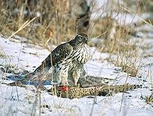 Certainly the most controversial aspect of the Cooper's hawks are their predations upon galliforms. By far the most regularly selected types are New World quails. Coveys of quails that attempt to evade predators by running into thick vegetation (which can allow them to successfully escape many predators) often find that Cooper's hawks are undeterred by this, as the hawks may chase them either on the wing or on foot into thickets.[227] However, one grouse was seen to successfully evade a hunting Cooper's hawk by diving belly first into about a foot of snow.[228] Cooper's hawks are often regarded as perhaps the most regular natural predator of northern bobwhites (Colinus virginianus). Indeed, the rate of predation by Cooper's does appear to exceed that committed by other species of hawk as well as that by large owls.[229][230][231][232][233] For instance, during winter in Wisconsin, Cooper's hawks were thought to kill 3.4-12.5% of the local bobwhite population.[234] However, the bobwhite appears to be a secondary prey species in all known studies and there is no evidence that Cooper's hawk predation alone can deplete bobwhite populations, unlike causes directly contributable to man such as overhunting and habitat destruction.[8][50][232][233] In Washington state, female Cooper's hawks took many California quails (Callipepla californica), which were estimated to constitute 47% of the prey selected by female hawks, but there was far too little impact overall to affect the quail's overall population.[180] In the rural areas outside of Tucson, Gambel's quail (Callipepla gambelii) were found to be the most regularly selected prey species, at 15.2% of 79 prey items.[100] A study of pellets in northwestern Mexico to determine if the local Cooper's hawks were regularly taking Montezuma quail (Cyrtonyx montezumae), finding that only one pellet consisted entirely of quail, the other pellets showing that hawks were mainly taking other prey, mostly doves.[235] Most regularly found galliforms in North America (including well-established exotics such as chukars (Alectoris chukar) and common pheasants (Phasianus colchicus)) are known to fall prey occasionally to Cooper's hawks.[223][236] These include assorted native grouse, including even the grassland-dwelling species (but excluding the more northerly distributed ptarmigans).[237][238][239] Juveniles usually are the more vulnerable and more regularly taken of non-quail galliforms by Cooper's hawks, but the hawks can take adults quite regularly despite the prey's relatively large size.[7] Adult ruffed grouse (Bonasa umbellus), weighing an estimated mean of 619 g (1.365 lb) when taken, are not infrequently exploited as prey, while adult sooty grouse (Dendragapus fuliginosus), estimated to weigh 1,050 g (2.31 lb) when taken have also been known to be taken repeatedly.[154][179][223][240][241] Adult male sharp-tailed grouse (Tympanuchus phasianellus), which average 1,031 g (2.273 lb), are also known have been successfully preyed upon by Cooper's hawks.[242][243] Even more impressive accounts show adult common pheasant estimated to weigh up to 1,158 g (2.553 lb) can be preyed upon by Cooper's hawks.[2][177] One wild turkey (Meleagris gallopavo) taken in Florida was cited with a weight of 5,336 g (11.764 lb), which is the size of an adult. However, given that this is of enormous size relative to a Cooper's hawk, it would require verification that the turkey was this large and was taken alive by the hawk.[50] Not unexpectedly, turkey poults are known to fall prey to Cooper's hawks.[244]