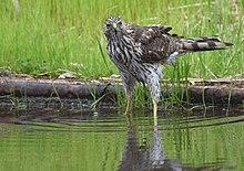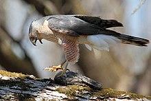 When hunting bats, they can follow all twists and turns, and may succeed in capture in up to 90% of hunts.[33] Much like goshawk, sometimes Cooper's hawks will capture rabbits by pursuing on the ground, half-running, half-flying.[33] Other on-foot hunting efforts, especially when chasing quail, have been detected as well.[7][62] When hunting sparrows, Cooper's hawks may make multiple passes on a bush before success and the efforts can take up to 45 minutes.[5] During hunts of rock doves (Columba livia) in urban areas, Cooper's hawks have been seen to engage in open air stoops to capture the prey.[164][165] An unusual harrier-like flight was seen in be engaged in by a Cooper's hawk before an attack on aquatic prey in a marsh.[5] Most prey is killed by repeatedly kneading the talons, with the kneading sometimes going on even after death, although in some cases birds are plucked while still alive.[5][166] Despite its gracile appearance, the Cooper's hawk, like the northern goshawk, is extremely powerful for its size and presumably able to capture larger prey relative to its size than other raptors such as falcons and Buteos (including red-tailed hawks (Buteo jamaicensis)) due to its unusually high-speed foot velocity and resulting impact during prey captures.[167][168] At times, after capture, Cooper's hawk have been seen to hold still living prey underwater, presumably trying to drown it.[5][169][170] Subsequent to the preys’ demise, they may eat the victim head first, followed by the viscera, with the meat eaten lastly.[56] Like other raptors who most regularly take birds, the Cooper's hawk was profiled in a study as an “attacker” rather than a “searcher” (i.e. mammal-hunters such as Buteos). “Attackers” such as Accipiters and large falcons usually had lower average hunting success rates, which averaged among the attacker species at 27%, due to the difficulty of capturing the prey.[171] 33% of 45 observed hunts in a study in Missouri were successful.[8] In Terre Haute, Indiana, about 23% of attacks by male Cooper's hawks and 20% by females were successful and were far more prone to being carried out in relatively open areas than those of nearby sharp-shinned hawk.[172] Post-fledgling pairs in Wisconsin were seen to hunt in sibling parties of 2–4, mainly pursuing chipmunks, and were observed to succeed in 56% of 18 hunting attempts.[173] During the first six weeks after the young hatch, in New York, it was estimated that a male Cooper's hawk would need to procure about 66 prey items over the period.[174] In these first six weeks in California, it was thought a minimum of 62 g (2.2 oz) would be required per nestling per day.[175]