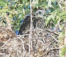 Sex ratio can skew towards male in eggs, nestlings and fledglings in about 54-60% in nests of Cooper's hawks in the region of Milwaukee. However the sex ratio corrected over time in the urban area to an even amount, though it is still skewed outside the city (skewed broods towards males occur in cases where the females may become too costly to bring up, needing longer development stages and more foods).[62][379][380] There are similar cases of male skewed ratios recorded now in southwestern cities (i.e. Tucson and Albuquerque).[381][382] Due to the female usually only beginning incubation with the third egg, the first three eggs often hatch on the same day, while the fourth and fifth eggs often hatch one (rarely up to three) day later.[7] New hatchling young average about 28 g (0.99 oz) in body mass and are about 9 cm (3.5 in) in total length.[5] Hatchlings are covered in white natal down with blue-gray eyes and are tan to pink on many of the bareparts.[7] While growth is slow for about three days, sexual dimorphism by size may begin by to be measurable by about seven days of age.[7] At about 10 days, the nestlings begin to engage in rather feeble standing and wing flapping.[5] The bill (at around 11 days) grows about twice as fast as the tarsus (at around 22 days).[7] At 13 days, the nestlings stretch their legs and often yawn, and at 16 days can be aggressive if the nest is breached by people.[33] Down first becomes deep and fluffy around two weeks, the following week first feathers among dense down, feather production accelerates but growth slows in the fourth week after which both increase for the fifth week.[33] By 16–18 days, the nestlings preen well, starts to rip at prey and flap well. Within first two weeks, the young Cooper's hawks begin to defecate over nest edge but often soil the edge of nest.[7] At three weeks often begin to stand up and feed by themselves and often begin to mantle prey away from each other.[5] The young grow is rapid for the period when they are 17 days old to about 23 days, growth then slows down abruptly before they nearly pause growth to feather out and then thereafter become fully grown.[7] At the age of three weeks a female nestling may stand and be able to fully feed herself.[33] Sometimes smaller, more agile male nest mates may snatch several bits of meat from their larger sister as if taking food from the mother.[33] Siblicide rarely has been proven for this species, and may occur "accidentally" at times. Sometimes a younger sibling that has died from other means may be eaten by the siblings or by the parents.[5] In one case, an entire brood of 4 nestlings from 2.5 to 3.5 weeks old were found dead in the nest, apparently having died due to exposure after consistent heavy rains.[5] Normal departure from nest is 30 days (up to 27 days) for males and 34 days for females, but averaged sooner in Oregon, at 27–30 days.[5][33] Response to the parents after the young Cooper's becoming branchers depends on their hunger levels. Snyder and Wiley recorded feeding rates of 0.267 per hour for a brood of 2 and 0.564 per hour for a brood of 4. In New York and Wisconsin, the sex ratio of broods roughly even, but slightly male biased in Wisconsin (53.5% or 137 against 119).[5] Food may be brought to the nest for the first ten days after the young leave it, as the young often return to rest on it or even to sun from it. Largely, the young are quiet until they leave the nest when they begin their loud, persistent hunger calls.[5] Around this stage, the young hawks will frequently engage in play with sticks and pinecones.[383] After they are about eight weeks old, they may start to hunt for themselves, but are usually still reliant on parents for food.[5] The young Cooper's hawks are frequently loud, voracious and aggressive in procuring food from the parents.[173] The parents soon seem to lose interest in feeding the young.[33] Fledgling occurs at 27–34 days (males averaging earlier), but the young may often returns to nest and are not fully feathered until about 50–54 days.[2][7] The siblings often stay within 4 m (13 ft) of each other even after leaving their parents range.[113][173] Siblings before long-distance dispersal may hunt together, although may too steal prey from one another.[56][62][384]