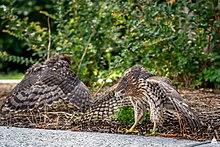 The Cooper's hawk is usually a top predator in the daytime but is not immune from attack by other predators.[7][287] The worst predator of this species is almost certainly the great horned owl (Bubo virginianus). This rather large owl (averaging more than three times heavier than a Cooper's hawk) is known to regularly track down fledglings and adults as well as raid the nests of other birds of prey. Many records show great horned owls will visit the nests of birds of prey and pick off the young nightly until the prey resource is exhausted (i.e. all young or sometimes adult birds of prey are killed).[288][289][290] Furthermore, given the opportunity, great horned owls readily expropriate the nests built by the raptors they kill as their own.[289][290] Given its preference for secluded wooded spots near woodland openings, Cooper's hawks are frequently the subject of unwanted attention from horned owls.[7][291] Both the young, especially around the time they leave the nest or are recently fledged, and adult Cooper's hawks are vulnerable to these owls.[7][179][292] While little data has been collected on the overall effect great horned owls have on Cooper's hawk populations, it is known that for the larger, more formidable goshawk that as many as 40% of radiotagged juveniles within a study appeared to meet their demise via horned owls.[7][293] Due to their threat level, the calls of great horned owls provoke a strong response from Cooper's hawks and banders and researchers usually utilize stimuli of great horned owls to attract a mobbing Cooper's hawks.[294][295] Reportedly, Cooper's hawks will temporarily tolerate and possibly even cooperate with crows when one or the other spots a great horned owl in the daytime, both species appearing to join forces to mob the threatening owl out of the vicinity.[5][291] In one case, after a great horned owl pair failed to successfully breed in a nest built by other Cooper's hawks, a pair of Cooper's who tried to nest was supplanted by horned owls, possibly of the same pair who had previously failed.[291]