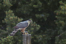 Birds are by far the leading prey for Cooper's hawks in most areas. A wide diversity of birds, considerably over 250 species, are known to be taken, constituting more than three-quarters of known prey species for these hawks.[7][62] A Cooper's hawk is estimated to kill an average of two birds a day, or 700 birds a year.[181] Although prior data mostly reflected the taking of adult birds, a study in Wisconsin revealed that Cooper's hawks may largely take young of the year, mostly fledglings but also not infrequently nestlings, during the breeding season. 74% of ageable bird prey in this study were young of the year.[182] Similarly, in Michigan during summer, immature birds were more than 2.5 times more often delivered to Cooper's hawk nests than adult birds.[154] In one case, a Cooper's hawk was seen to fly away with an entire occupied nest of American goldfinches (Spinus tristis).[183] One study determined that birds that nest in the canopy level tended to nest fairly close to this hawk but those with mid-level, shrub level and ground level nests nested farther away, indicating that non-canopy-nesting birds are generally taken during the breeding season.[184] Key to prey selection for Cooper's hawk is the availability and abundance of birds in a given region.[50][180] Therefore, the extremely numerous American robin (Turdus migratorius) appears to be the most widely reported prey species. Robins were the leading prey species in northwestern Oregon, at 19.6% of 281 prey items, Lopez Island, Washington, 23.4% of 107 prey items, in Victoria, British Columbia, at 34.6% of 2896 prey items and prominent but ranked second also in California (Berkeley and Albany) food studies, 24.5% of 1057 prey items.[179][180][185][186] The robin is regularly hunted in all seasons due to its commonality in exurban regions, with both adults, at estimated averages of 79 to 81.2 g (2.79 to 2.86 oz) when taken, and young being relatively easy for them to access.[8][179][187] Beyond the common robin, nearly all thrushes in North America (excluding one species whose breeding range is largely north of the Cooper's range and one rare, little-studied species) are opportunistically hunted by Cooper's hawks.[47][50][179][188][189][190][191] The closest rival to the robin in being most widely taken as prey for Cooper's hawks may be the common starling (Sturnus vulgaris), a non-native bird in North America with mean weights when taken of 79 to 82 g (2.8 to 2.9 oz). The starling was the main food for these hawks in Ithaca, New York, at 28.2% of 857 prey items, and Terre Haute, Indiana, at 56.5% of 57 prey items, and taken in large but somewhat secondary numbers in Missouri, Michigan, and Victoria, British Columbia.[8][154][174][185][178] In the urban environment of Terre Haute, it was found that starlings were taken in almost the same proportion as starlings were of all birds observed by researchers (i.e. they were 60% of 2146 individual birds seen).[178]