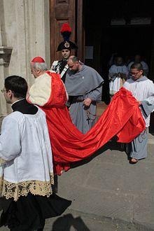 The motu proprio Valde solliciti[4] of 30 November 1952 ordered that the train of the cappa magna should be shortened by about half (from 15 metres to 7).[5] The 1969 Instruction on the Dress, Titles and Coats-of-arms of Cardinals, Bishops and Lesser Prelates[6] laid down that: