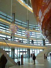The foyer floor is Sicilian Perlatino marble. The central foyer holds three spherical chandeliers created by the Icelandic artist Olafur Eliasson. Each chandelier consists of several pieces of glass, which are semipermeable allowing some light to pass, and some to reflect. The patterns change when viewed from different angles. Designer and artist Per Arnoldi designed the logo for the opera, visible in the marble floor just inside the entrance. Painter and sculptor Per Kirkeby (1938–2018) created four bronze reliefs for the wall to the auditorium, just below the maple wood part. Per Arnoldi also designed the Front curtain for the main stage, made of multiple color threads creating a three-dimensional effect, that does not reproduce well in photographs.[16] [17] [18][19]
