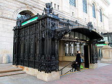 Copley station was opened October 3, 1914, as part of the Boylston Street subway, an extension of the original Tremont Street subway.[1] The ornate wrought-iron head house next to the Boston Public Library was designed by the firm Fox, Jenny & Gale.[3] Originally Copley had light blue and white tile mosaic for the station name on the walls; however, none of these have survived.