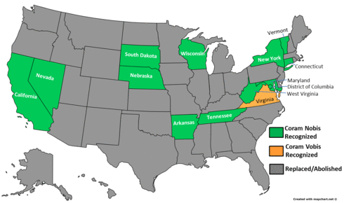 The following table provides whether each state's courts are authorized to issue a writ of coram nobis (or a writ of coram vobis), or provides the state statute which replaced or abolished the writ.