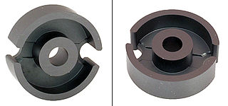 Usually ferrite or similar. This is used for inductors and transformers. The shape of a pot core is round with an internal hollow that almost completely encloses the coil. Usually a pot core is made in two halves which fit together around a coil former (bobbin). This design of core has a shielding effect, preventing radiation and reducing electromagnetic interference.