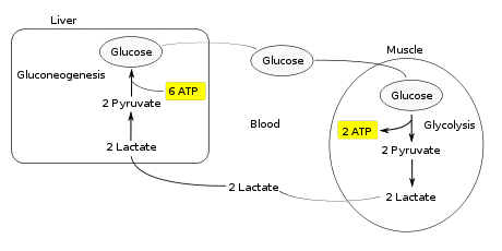 Instead of accumulating inside the muscle cells, lactate produced by anaerobic fermentation is taken up by the liver. This initiates the other half of the Cori cycle. In the liver, gluconeogenesis occurs. From an intuitive perspective, gluconeogenesis reverses both glycolysis and fermentation by converting lactate first into pyruvate, and finally back to glucose. The glucose is then supplied to the muscles through the bloodstream; it is ready to be fed into further glycolysis reactions. If muscle activity has stopped, the glucose is used to replenish the supplies of glycogen through glycogenesis.[3]