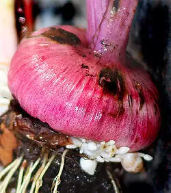 Internally, a typical corm mostly consists of parenchyma cells, rich in starch, above a circular basal node from which roots grow.