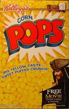Corn Pops is a puffed grain breakfast cereal made by Kellogg's, described by the company as "crunchy sweetened popped-up corn cereal." The cereal was introduced in 1950 as Corn Pops.[1] In 1951, the name was changed to Sugar Corn Pops[2] and later it was called Sugar Pops. It was the sponsor for "The Adventures of Wild Bill Hickok" radio and television show. The name was changed to Sugar Corn Pops in 1978, and finally to Corn Pops in 1984, a time when many cereals dropped the word "sugar" from their titles for marketing reasons. In January 2006, the name of the cereal was changed to Pops, but after a few months of poor reception, was changed back to Corn Pops.