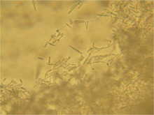 When grown in the lab on very simple media, it behaves like baker's yeast, forming single cells called sporidia. These cells multiply by budding off daughter cells. When two compatible sporidia meet on the surface of the plant, they switch to a different mode of growth. First, they send out conjugation tubes to find each other, after which they fuse and make a hypha to enter the maize plant. Hyphae growing in the plant are dikaryotic; they possess two haploid nuclei per hyphal compartment. In contrast to sporidia, the dikaryotic phase of U. maydis requires infection of the plant to grow and differentiate, and cannot be maintained in the laboratory.