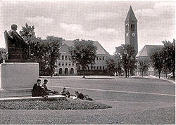 Lincoln Hall (1888) also stands on the eastern face of the quad next to Goldwin Smith Hall. On the northern face are the domed Sibley Hall and Tjaden Hall (1883). Just off of the quad on the Slope, next to Tjaden, stands the Herbert F. Johnson Museum of Art, designed by I. M. Pei. Stimson Hall (1902), Olin Library (1959) and Uris Library (1892), with Cornell's landmark clocktower, McGraw Tower, stand on the southern end of the quad.