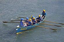 The sport is governed by the Cornish Pilot Gig Association, which monitors all racing gigs during the construction phase. The Association's Standards Officer is responsible for measuring every gig at least three times during construction, to ensure that it conforms to the Standard set by the Association. Gigs are crewed by six rowers, and helmed by a coxswain.[3] Modern gig racing dates from 1986, the founding of the CPGA, and the codification of class rules for the construction of new gigs.[4]