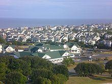 Previously a quiet and little-known location, a development boom in the 1980s sparked growth in the area, and since then, Corolla has become a popular vacation destination. Resting between the Currituck Sound and the Atlantic Ocean, Corolla attracts mainly beach-goers, especially in the summer months. Corolla is home to numerous attractions such as the historic Whalehead Club, Currituck Beach Light, Center for Wildlife Education, and is known for its numerous locations for shopping, dining, and participating in water sports.[2][3]